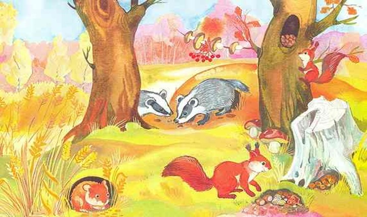 Глаголы: охотится, крадётся, воет, пугается, скачет, переваливается, хитрит, выслеживает, запасает; рыть, зимовать, залегает, впадает (в спячку).